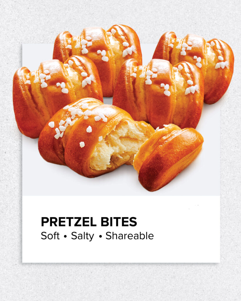 Whether enjoyed on their own or finished simply to suit your menu, Pretzel Bites bring warmth, texture and shareability to any offering.